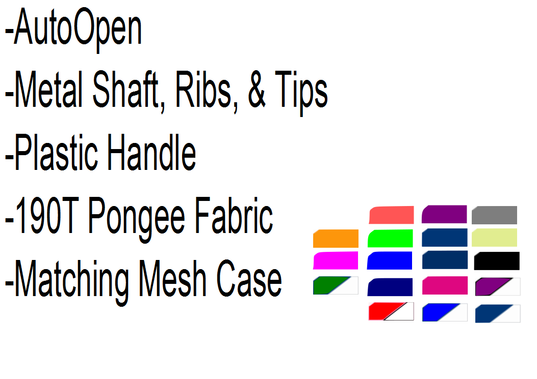 Umbrellas Catagories Just In! 37In 42In 46In 48In 54In 60In 62In 68In Childrens Umbrellas Auto / Auto Solid Deluxe (UM-001W) Auto Open Two-Tone Deluxe (UM-002W) Auto Deluxe Black (UM-003) Super Mini (UM-011) Solid Deluxe (UM-035) Auto Deluxe (UM-046) Auto Windproof Super Mini (UM-048) Auto Deluxe (UM-492) 42" Auto Open Deluxe UM-492 50 Pieces 100 Pieces250 Pieces 600 Pieces1200 Pieces 5(P) $12.50 $12.00$11.50$11.00$10.50 50(P)
